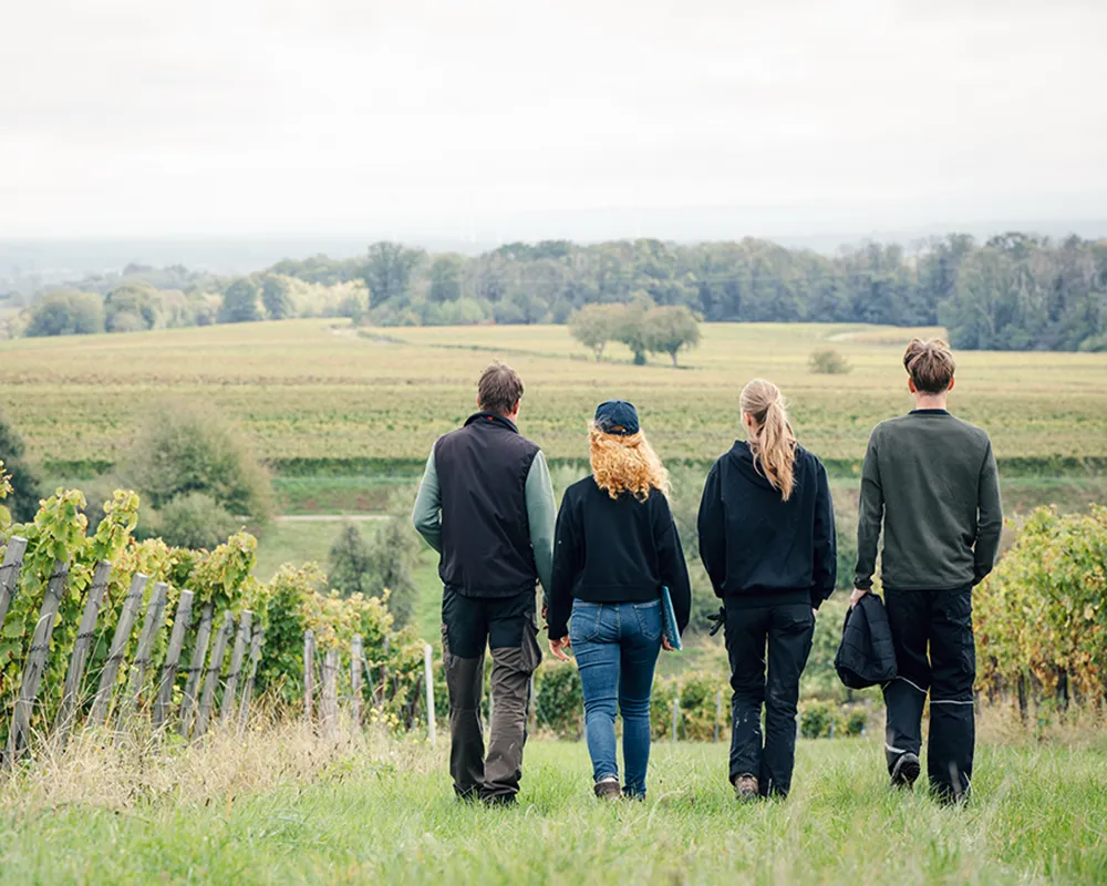 Konkret bedeutet das: Wir bringen keine Herbizide und chemisch-synthetischen Wirkstoffe mehr aus, sondern vertrauen auf rein biologische Stärkungspräparate und die Mitarbeit von Nützlingen unter den Insekten und Kleinlebewesen. Zur Förderung eines stabilen, natürlichen Gleichgewichtes von Pflanzen und Tieren legen wir im Wechsel begrünte und unbegrünte Gassen im Wingert an. Gründüngung mit Kräutern und Blüten verbessert nicht nur die Bodenqualität, sondern bietet hilfreichen Schlupfwespen, Florfliegen und anderen Nützlingen natürlichen Lebensraum.
