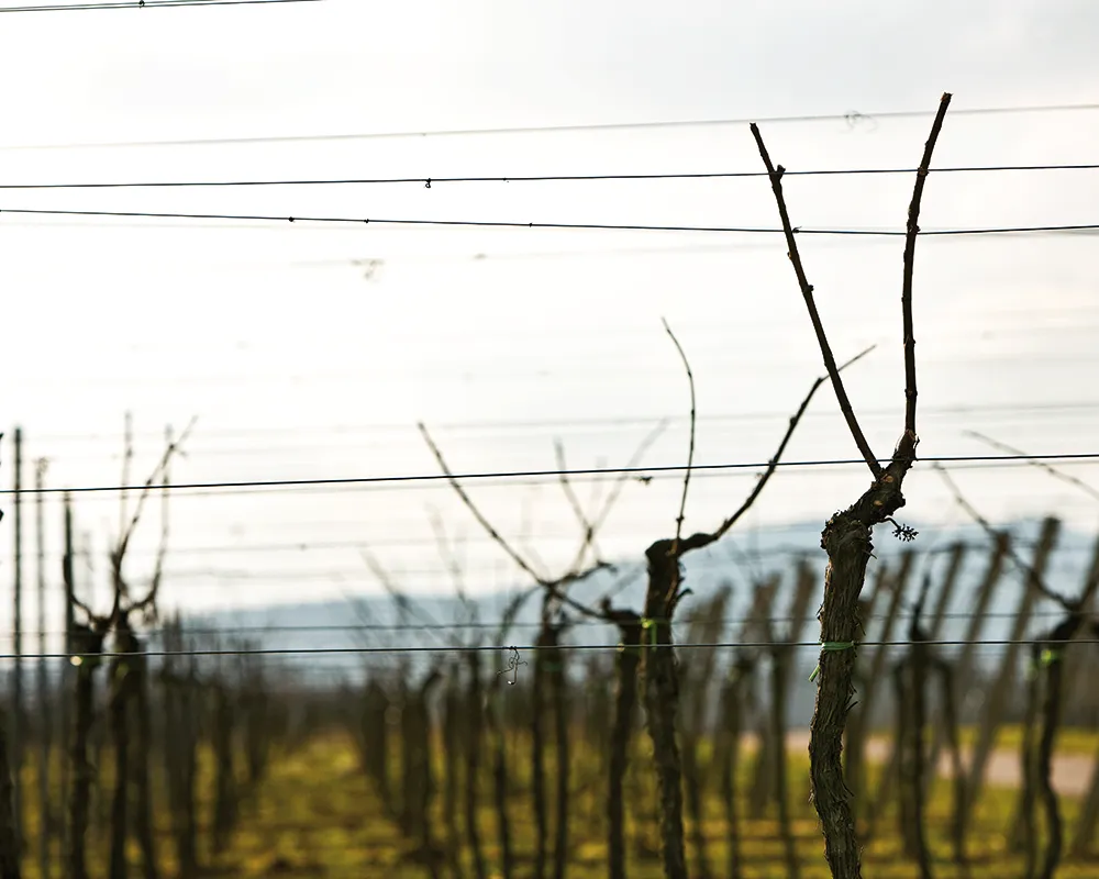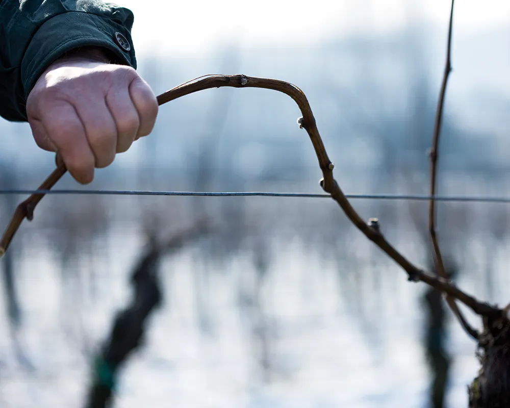 Die Vegetation macht Winterpause. Aber wir nicht. In dieser kalten Zeit beginnt die Arbeit im Weinberg. Während die Moste des vergangenen Jahrgangs im Keller noch heranreifen, wenden wir uns dem neuen zu – mit den ersten erzieherischen Maßnahmen. Schon der Anschnitt der Reben weist den Weg zu einem geringen Ertrag, der die Rebe nicht überfordert und ihr nur die Menge an Früchten abverlangt, die sie auch gut versorgen und zur vollen Reife bringen kann.
