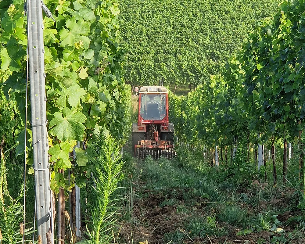 Wein fordert Hinwendung. Und er verzeiht uns keine Nachlässigkeiten. So beginnt nach dem Rebschnitt eine ganze Reihe pflegerischer Arbeiten: 30 bis 40 Mal gehen und fahren wir durch die Zeilen, binden Ruten an, schneiden das Laub und die überschüssigen Triebe, bearbeiten, mulchen und lockern den Boden, entblättern zur Herbstreife hin die Traubenzone und schneiden minderwertige Trauben heraus.