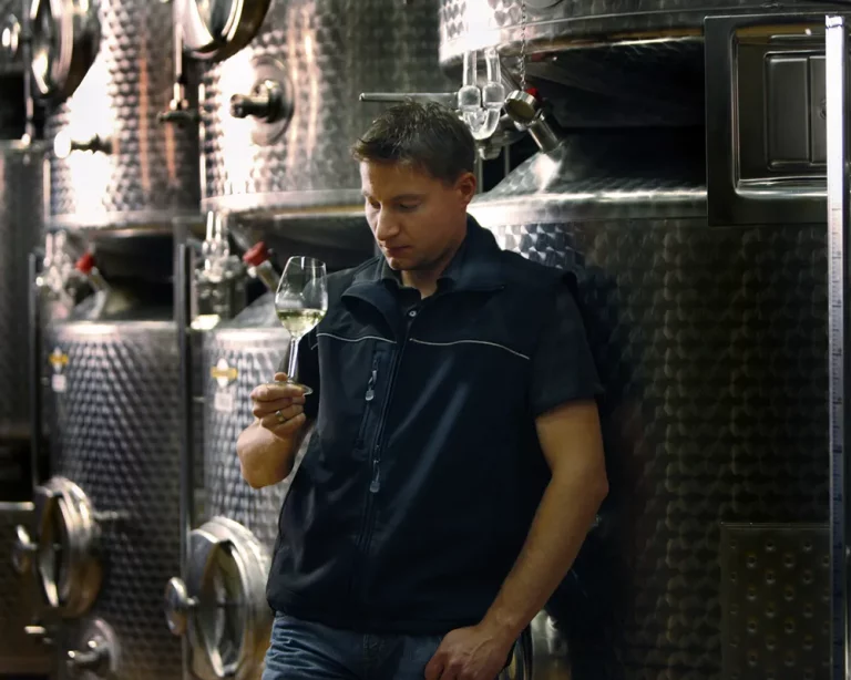 Mit dem Abstich, der Trennung des vergorenen Weines vom Hefelager, lassen wir uns viel Zeit. Weißwein und Rotwein werden auf unterschiedlichem Wege ausgebaut: Weiße Gutsweine vergären und lagern in aller Regel komplett im Edelstahltank. Von den weißen Ortsweinen kommt ein Anteil von 30 bis 40 Prozent direkt ins Holz; weiße Lagenweine genießen zu 100 Prozent den Ausbau im Holzfass.